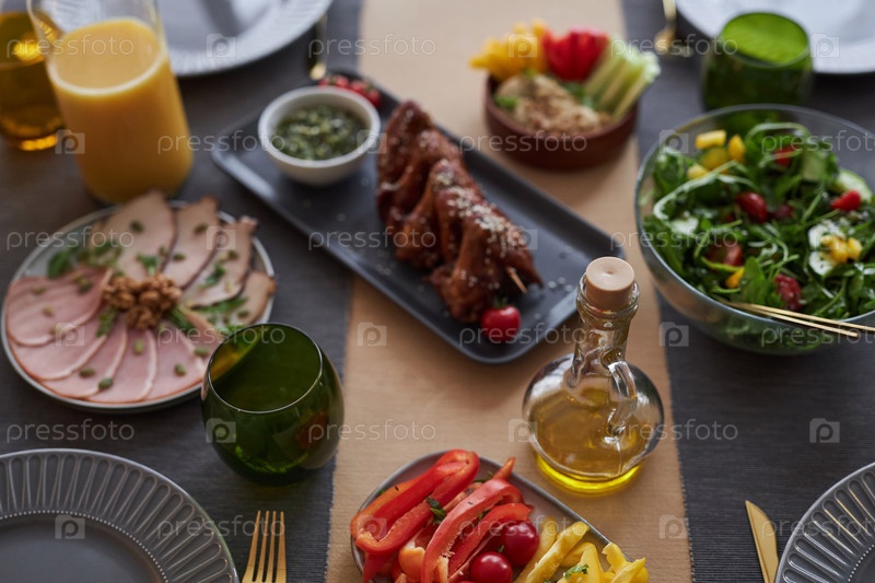 Близкий обзор закусок и легких блюд на обеденном столе, установленный с едой