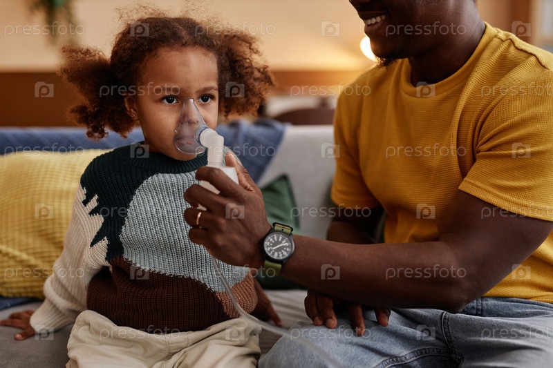 Папа кладет маску с небулайзером на лицо дочери