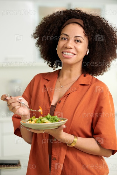 Улыбающаяся латиноамериканка ест вкусный салат на обед