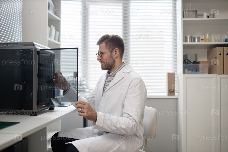 Техник, изучающий изготовленный 3D-образец костного образца Мужчина
