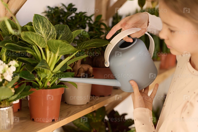 Молодая девушка поливает комнатные растения