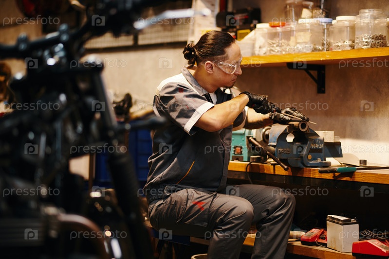 Ремонтник, ремонтирующий мотоцикл Подробности