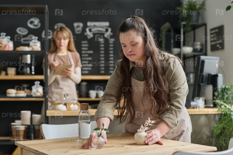 Официантка кладет маленькие вазы на стол