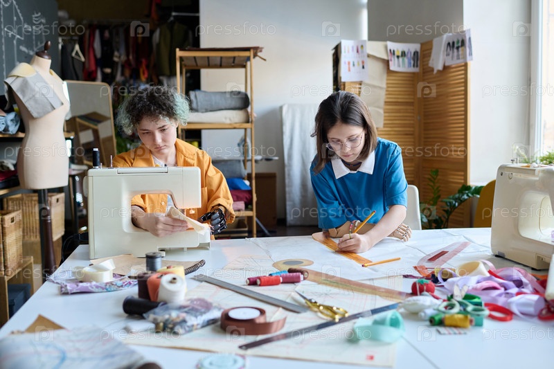 Две девушки шиют одежду, работая в ателье