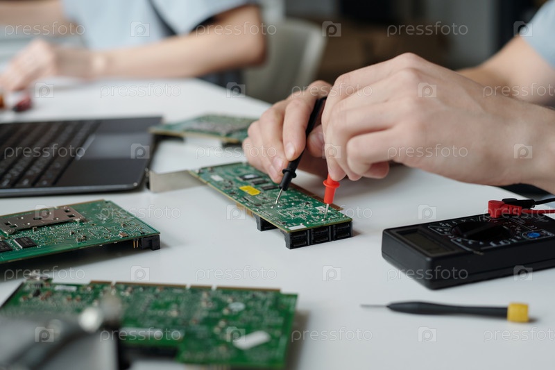 Руки инженера проверяют материнскую плату