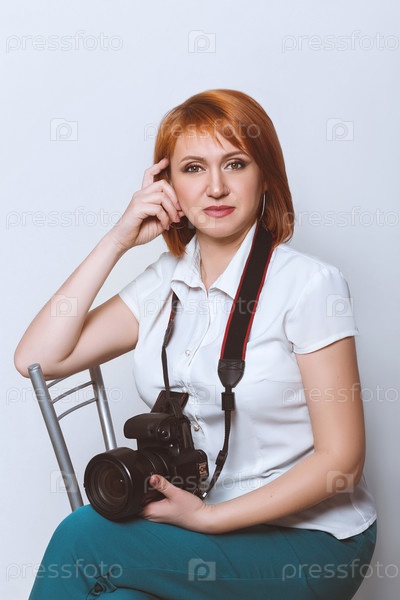 Женщина-фотограф в деловой одежде с фотоаппаратом сидит на стуле