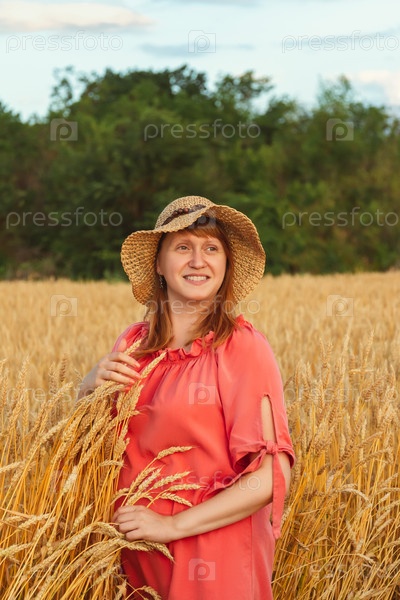 Женщина вечером среди колосьев пшеницы смотрит вперед и улыбается