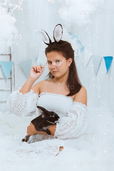 Серьезная молодая девушка в белом наряде с кроличьими ушками и очками держит маленького черного кролика. Отношения между людьми и домашними животными