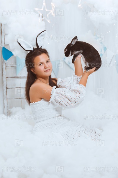 Девушка с черными кроличьими ушками в облаках играет с черным кроликом. Отношения между человеком и домашним животным
