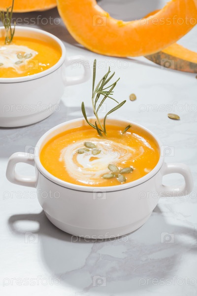 Тыквенный крем-суп со сметаной, семенами и розмарином в тарелке на тыквенном фоне