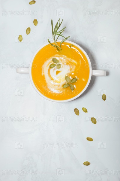 Суп-крем из тыквы со сметаной, семенами и розмарином в тарелке с местом для копирования, вид сверху