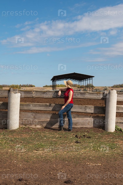 Женщина опирается на забор загона для скота, лошадей на ферме и смотрит вдаль