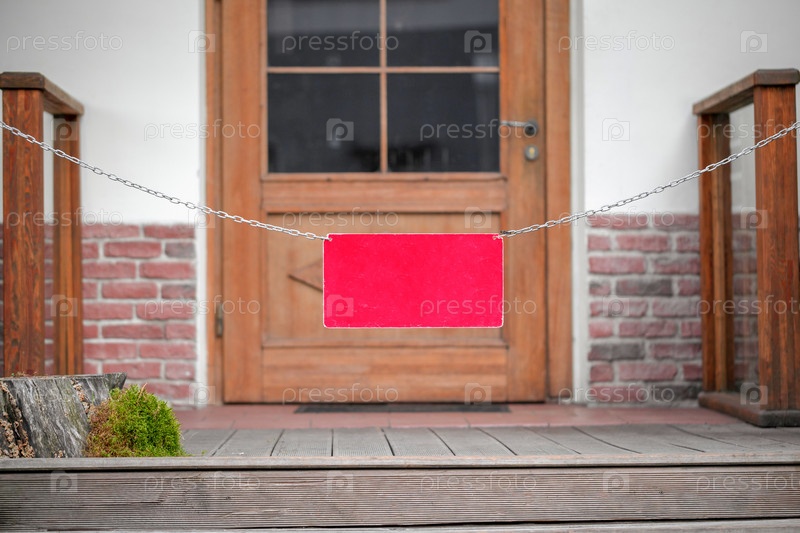 Красная табличка на цепи, блокирующая вход в кафе, закрытое кафе, размытый фон