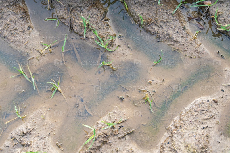 Следы сельскохозяйственной техники в мокрой скользкой грязи на поле