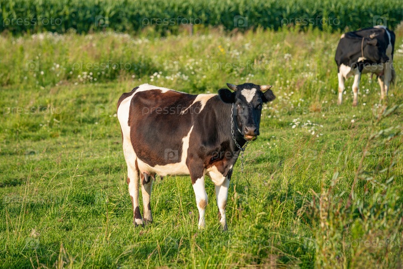 Коровы пасутся на сочном лугу в летний день