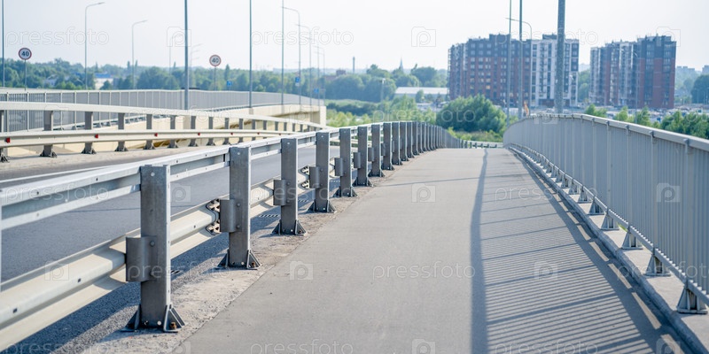 Проезжая часть моста с металлическими перилами высотных зданий на заднем плане