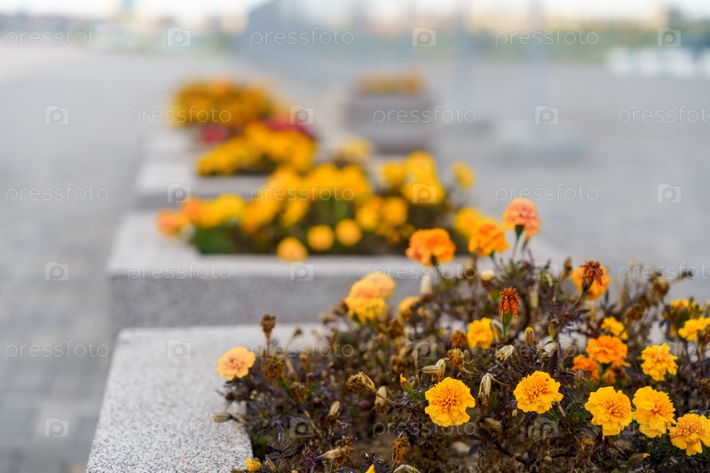 Желтые цветы на клумбах на тротуаре в городе