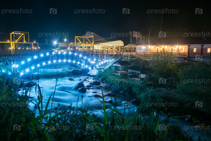 Горная река Аламедин ночью на фоне освещенного моста