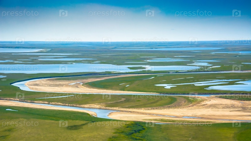 Пейзаж арктической тундры летом. Реки, озера, северная растительность. Вид сверху. Концепция изменения климата, потепление в Арктике