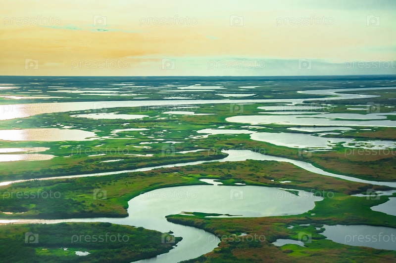 Вечерний закат в северной тундре. Летний арктический пейзаж. Концепция изменения климата, потепление в Арктике
