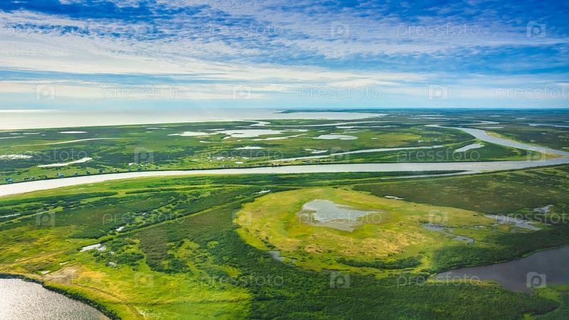 Пейзаж арктической тундры летом. Реки, озера, северная растительность. Вид сверху. Концепция изменения климата, потепление в Арктике