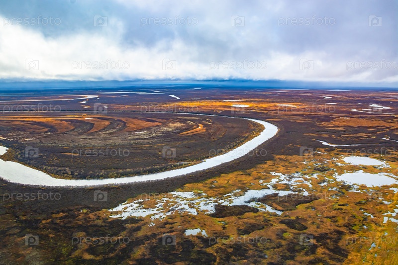 Фотосъемка с вертолета в Арктике. Осенний природный ландшафт северной тундры. Пейзаж из множества озер, рек, пестрых мхов и лишайников. Хмурое осеннее небо
