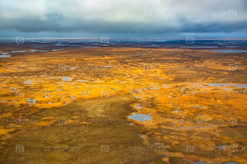 Фотосъемка с вертолета в Арктике. Осенний природный ландшафт северной тундры. Пейзаж из множества озер, рек, пестрых мхов и лишайников. Хмурое осеннее небо