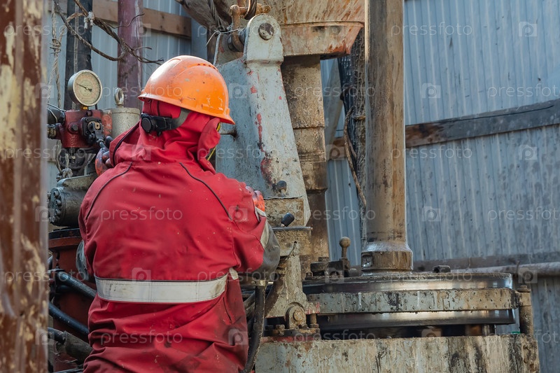 Рабочий бурильщик в красной форме, в каске и очках. Он использует гидравлический ключ, чтобы завинтить бурильные трубы, опустить их в нефтяную скважину и продолжить ее бурение. Понятие работающего человека