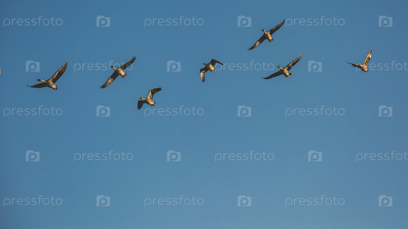 Стая диких гусей летит на фоне голубого неба