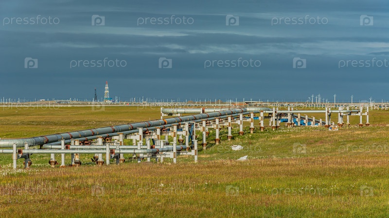 Инфраструктура добычи и транспортировки нефти и газа. Северное поле. Арктическая природа. Трубопроводы. Буровая установка на горизонте