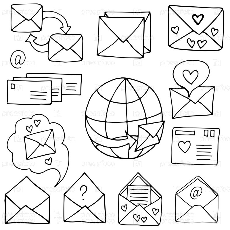 Набор почтовый , черно-белые элементы для дизайна без фона для раскрашивания