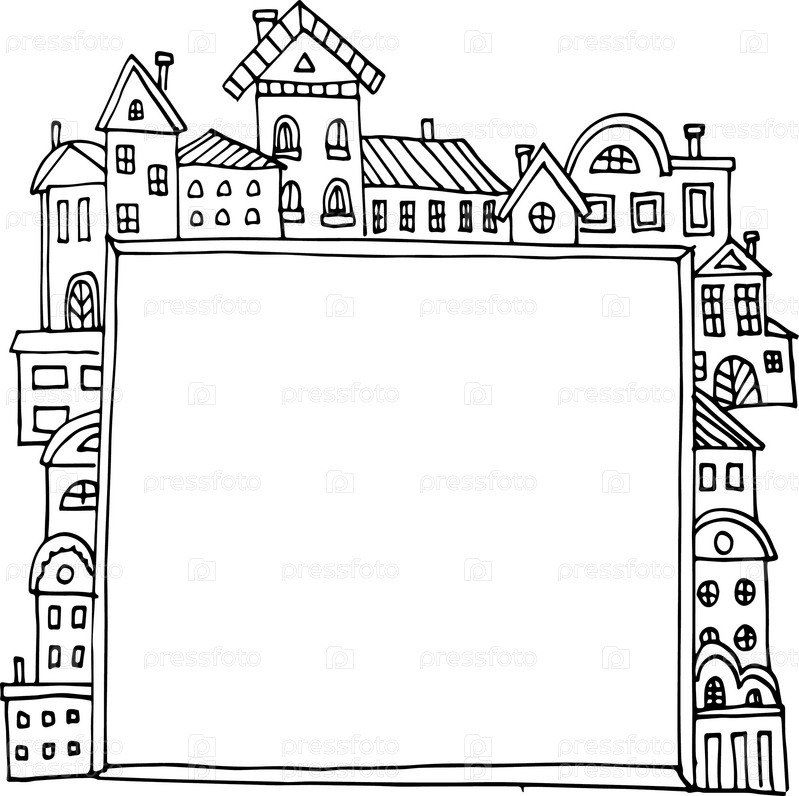 Рамка с местом для текста с разными домиками, рамка для фото, раскраска