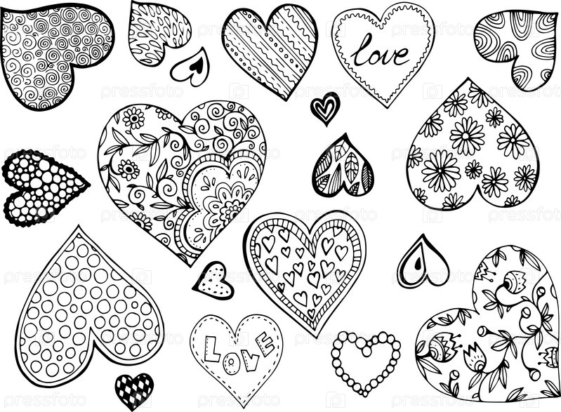 Набор изолированных черно-белых клипартов сердечки в декоративном стиле с орнаментами