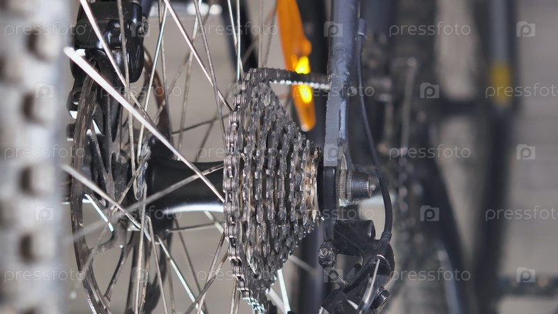 Крупный план трансмиссии горного велосипеда. Кассета с цепочкой. С другой стороны колеса тормозной диск с суппортом. Ремонт и обслуживание велосипедов в специализированной мастерской