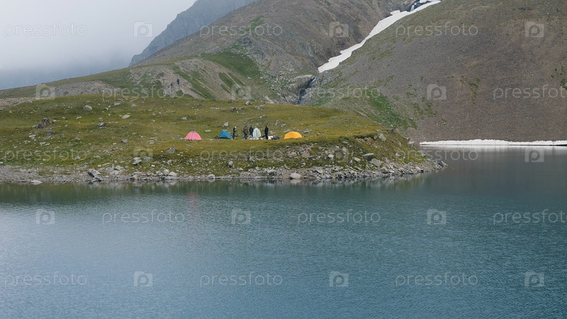 Чистое горное голубое озеро. Горы возвышаются над нами. На берегу озера находится туристический лагерь. Яркие палатки, туристы наслаждаются спокойной атмосферой дикой природы