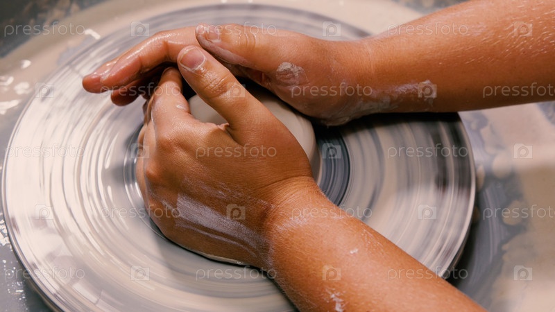 Крупный план рук гончара за работой, формирующих произведение искусства из белой глины на гончарном круге. Понятие ручного труда, искусства и мастерства
