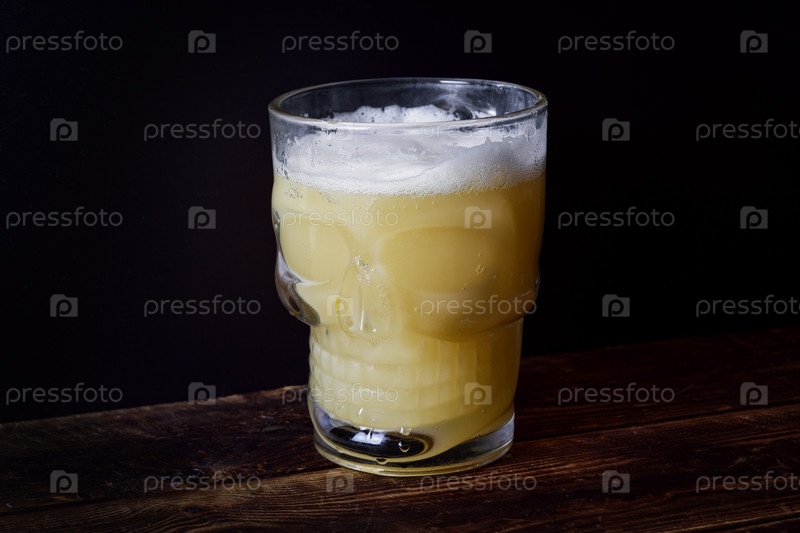 Пивная кружка в виде черепа с пенным светлым пивом на деревянном столе на черном фоне