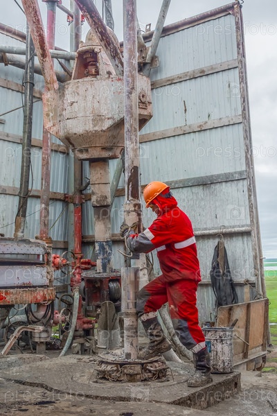 Гыданский полуостров / Россия - 11 августа 2019 года: Рабочий бурильщик в красной форме, в шлеме и очках. Он устанавливает бурильные трубы для завинчивания и спуска их в нефтяную скважину и продолжения ее бурения. Понятие работающего человека
