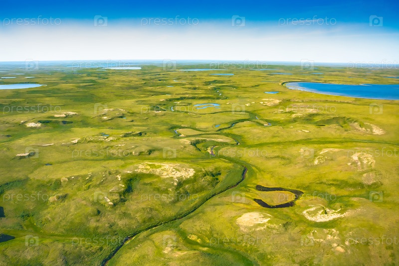 Пейзаж арктической тундры летом. Реки, озера, северная растительность. Вид сверху. Концепция изменения климата, потепление в Арктике