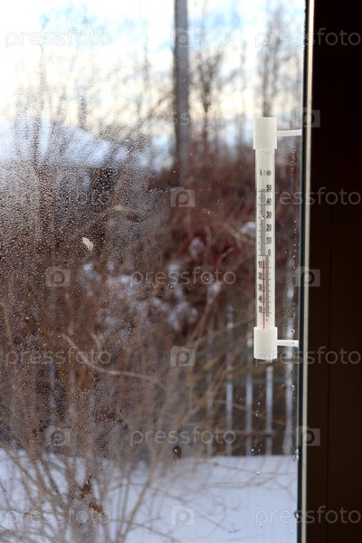 Пластиковый термометр за окном деревенского дома зимой