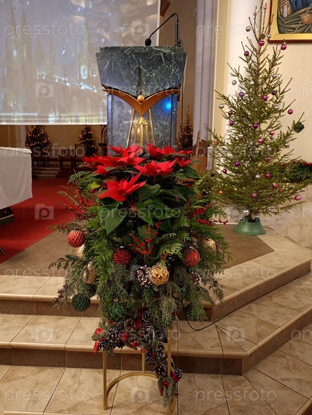 Цветы пуансеттии и еловый венок с шарами, рождественская ель в Соборе Непорочного зачатия Девы Марии в Москве