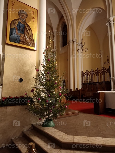 Рождественский интерьер с елью и иконой в Соборе Непорочного зачатия Девы Марии в Москве