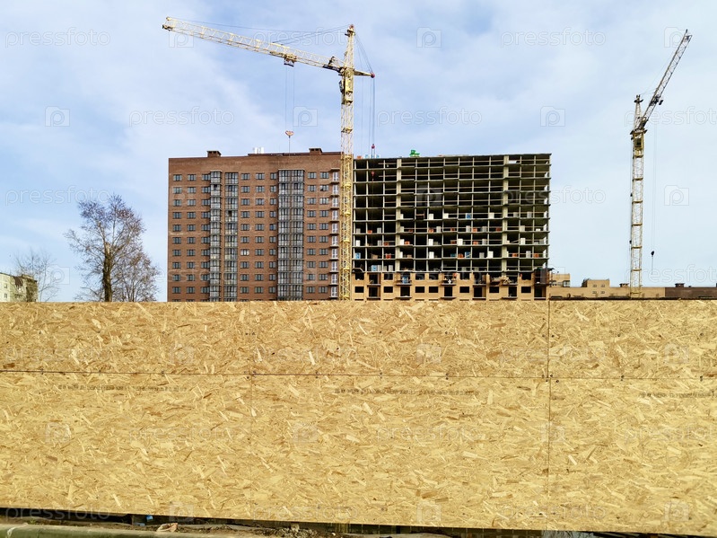 За прочным деревянным забором на строительной площадке работают кран и рабочие