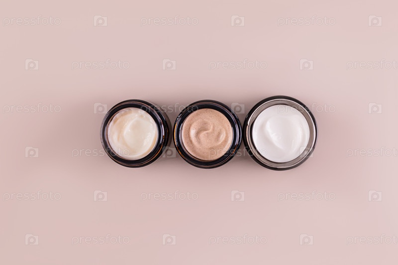 Баночки с косметическим кремом разной текстуры и цвета для ухода за кожей лица и тела. Бежевый фон. место для текста. Вид сверху