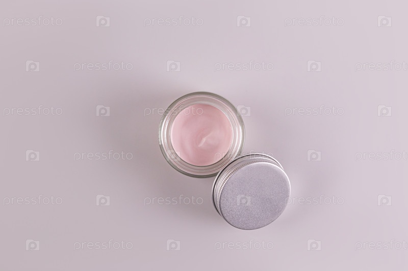 Вид сверху на открытую банку косметического продукта с нежной розовой текстурой для повседневного ухода за кожей лица и тела. спа. массаж. Серый фон