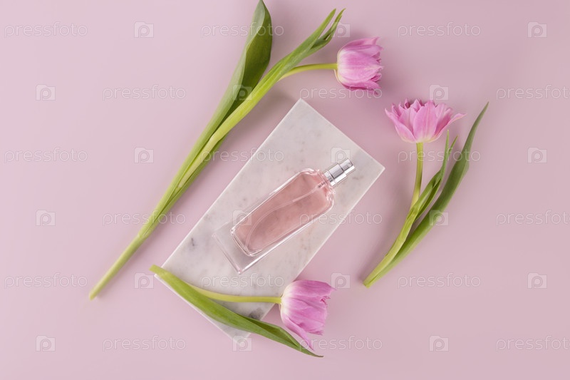 Шикарный флакон женских духов лежит на белом мраморном подиуме среди розовых нежных тюльпанов. Вид сверху. Розовый фон. Концепция красоты и ароматов