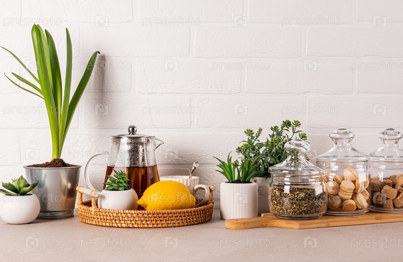 Стильный кухонный фон со стеклянным чайником, лимоном, чашкой, баночками для чая, сахаром, печеньем безе. Зеленые растения в горшках. Передний план. Стена из белого кирпича