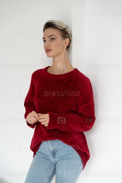 Молодая красивая женщина позирует в красном свитере в студии