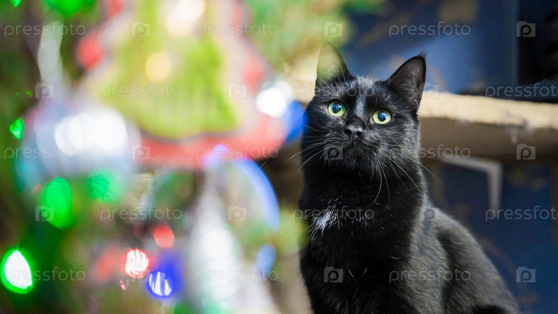 Черный кот с удивлением смотрит на елку с праздничными огнями