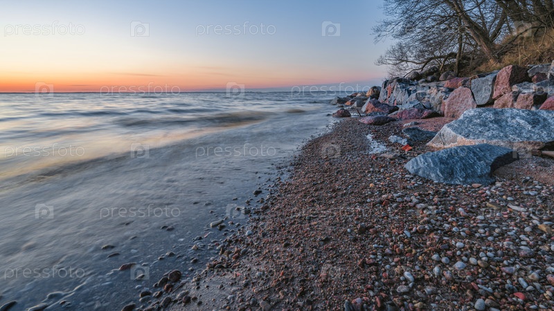 Оранжевый закат на скалистом берегу моря на заднем плане